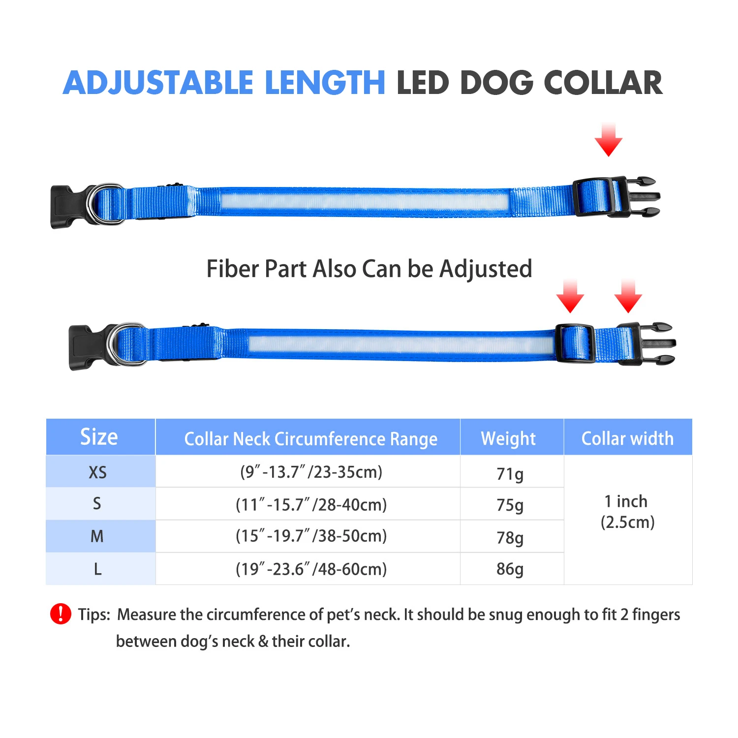 The led dog collar have S / M / L size ( S: 40*2.5cm; M: 50*2.5cm; L: 60*2.5cm ), you can choose the size of it according your dog’s size, no need to worry about the unfit for your dog.